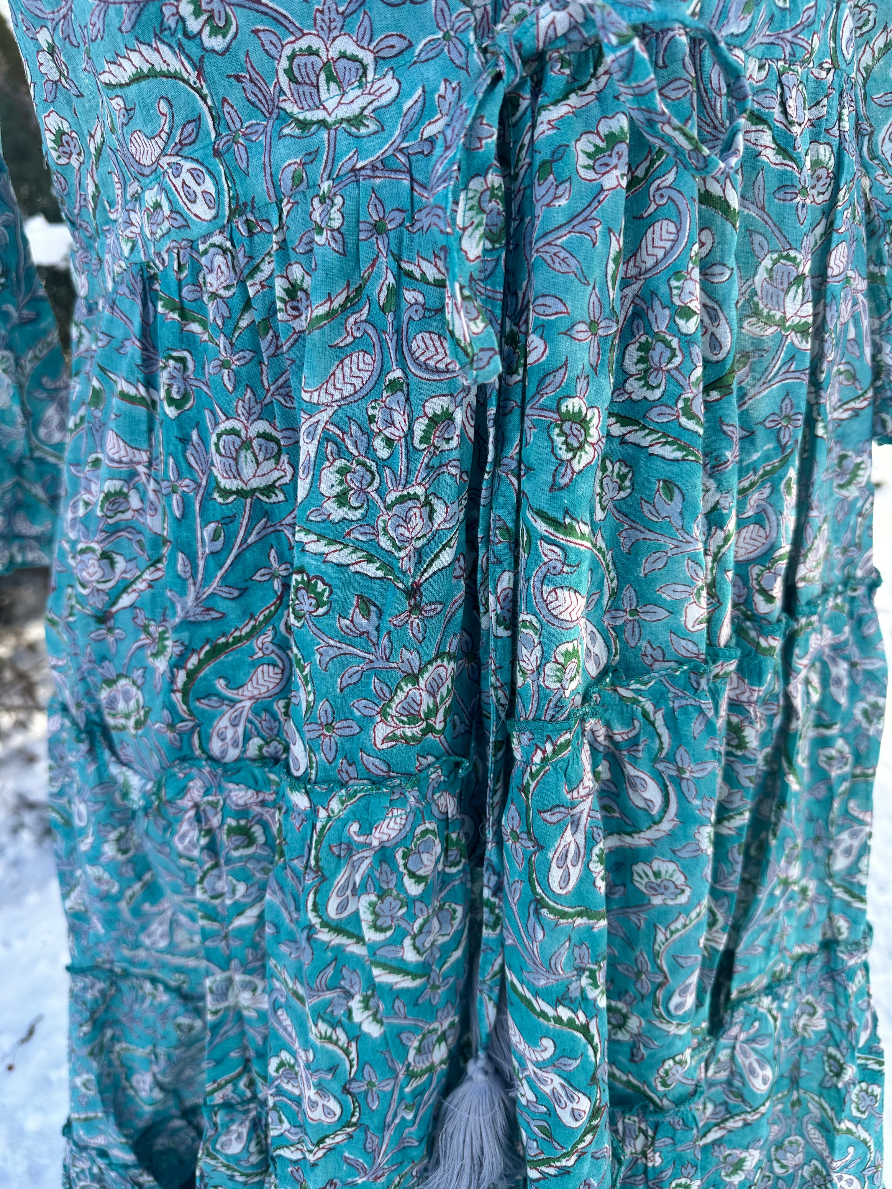 "Step into effortless elegance with our lightweight, three-layered block print cotton dress. It is designed for comfort and versatility and features a flattering waist-synching design, practical pockets, and three-quarter sleeves, perfectly blending style and function. The beautiful tassel detail adds a touch of charm. Made from ultra-soft, breathable cotton, this dress ensures all-day comfort. Depending on your preference, a slip may be needed for added coverage. “Care instructions: Machine wash cold on delicate cycle and hang or air dry.